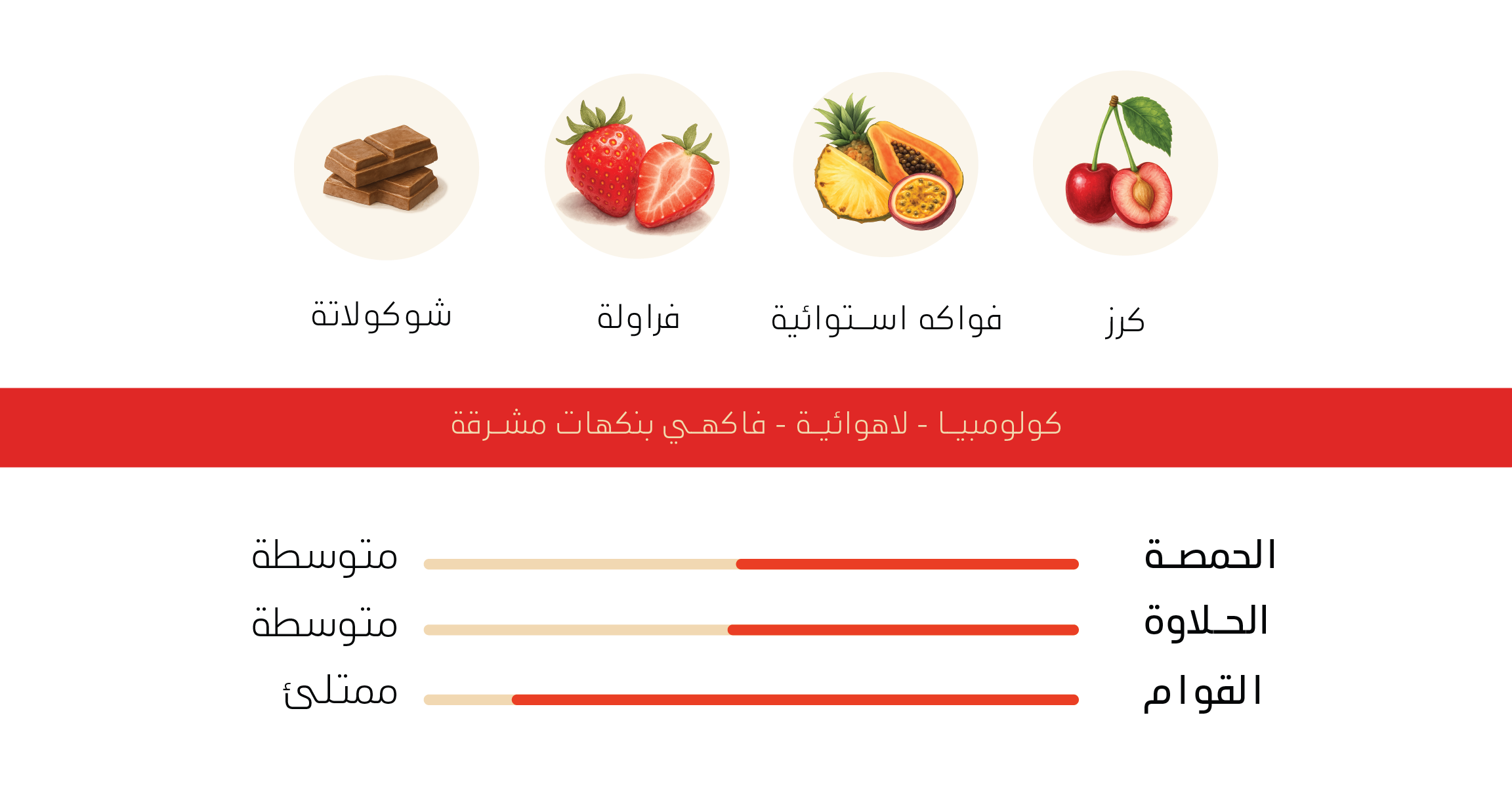 "من المحمّص": نكهات فاكهية شبيهة بالكرز الطازج، خيار مميز لمحبي النكهات المشرقة سواء في الفلتر أو القهوة المثلجة.
