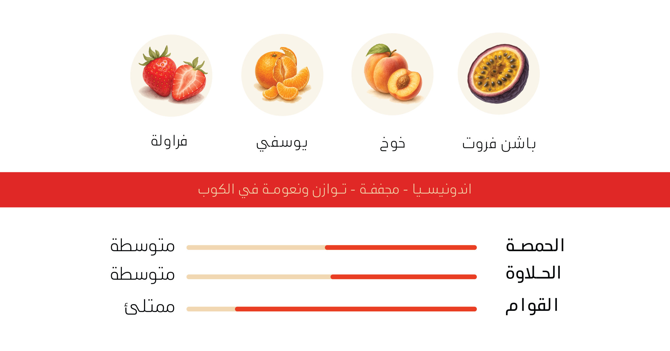 قهوة اندونيسية مجففة بطابع فاكهي مع لمسات حارة وعشبية خفيفة، تجربة مختلفة لعشاق القهوة ذات التعقيد العالي.